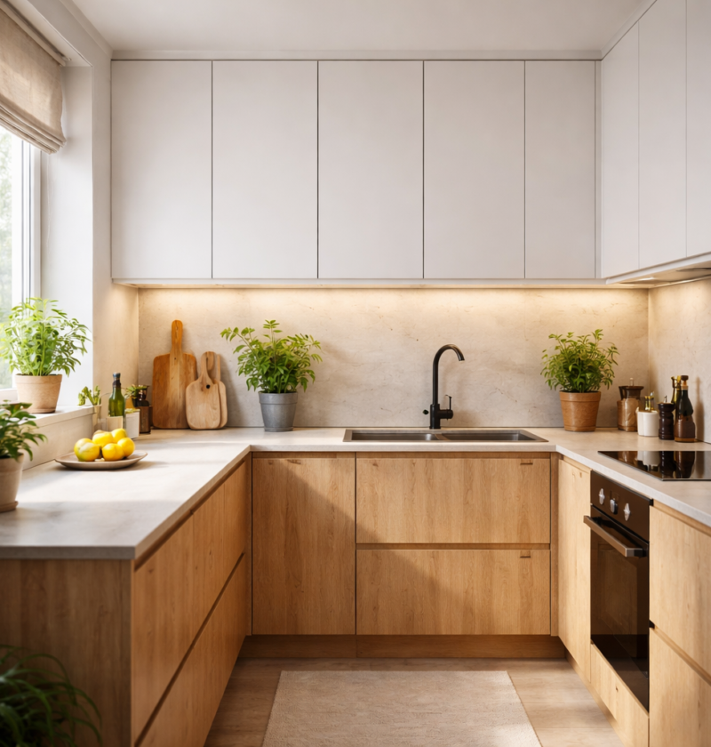 Praktičnost kuhinje je tesno povezana z izbiro materialov. Pri delovnih ploščah je treba upoštevati odpornost na toploto, praske in madeže. Laminat je lahko povsem primeren, če je kakovosten in pravilno zatesnjen na stikih, težave pa nastanejo pri slabi montaži, ko voda prodre v spoje in začne dvigovati robove. Kamen in kompoziti so praviloma bolj odporni, a zahtevajo pravilno izvedene izreze pri koritu in kuhalni plošči, da ne pride do mikro razpok. Les je topel in vizualno prijeten, vendar zahteva redno nego in hitro brisanje vode, sicer se pokažejo sledi in razbarvanja.