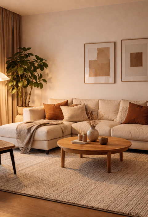 Najopaznejši premik v estetiki je odmikanje od hladne, strogo linearne moderne. Oblike se zaoblujejo, robovi se mehčajo, površine postajajo toplejše na dotik. To ne pomeni, da se vrača težak klasičen slog, temveč da se minimalizem preoblikuje v bolj humano različico. Oblazinjenje z izrazito teksturo, bouclé, melirane volne, krtačeni žameti in gosto tkane tkanine delujejo vizualno bogato tudi v nevtralni barvni paleti. V praksi to prinese manj potrebe po dekorju, ker material sam ustvari karakter.