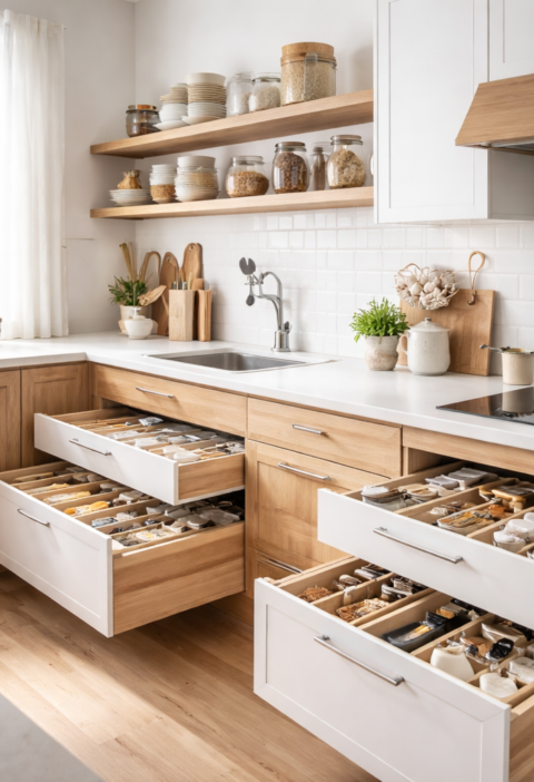 Učinkovito shranjevanje se premika od naključnih predalov k namenskemu zoniranju. Več gospodinjstev si želi, da kuhinja na pultu ostane prazna. To pomeni, da morajo imeti mali aparati svoje mesto z dovolj prezračevanja, sicer se v zaprtih nišah nabira toplota in kondenz. Posebej problematične so slabo prezračevane omare ob pečici ali aparatih za kavo, kjer toplota dolgoročno vpliva na lepilne spoje in robne trakove.