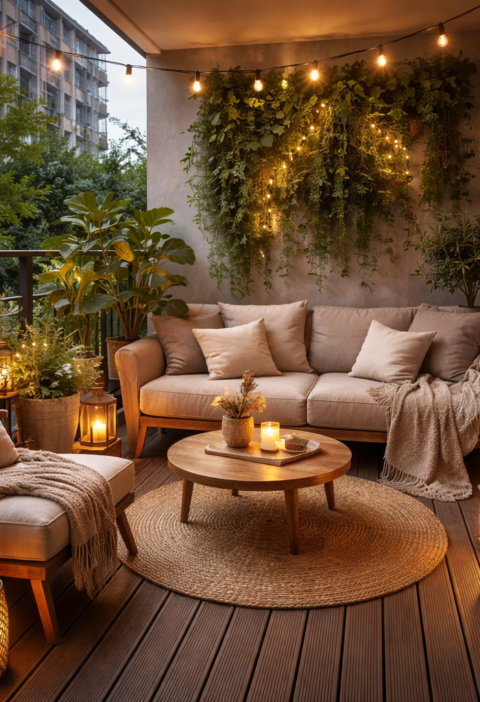 Ko se določi osnovna pot in glavna funkcija, se prostor razdeli v cone. Na večjih terasah je smiselno ločiti jedilni del od lounge dela. Na majhnem balkonu se cone ustvarijo z višino, na primer z ozko klopjo z integriranim shranjevanjem, z vertikalnim zelenjem ali s preprogo za zunanjo uporabo, ki vizualno zameji sedenje. Ta pristop je praktičen, ker prepreči občutek, da je vse naključno postavljeno, hkrati pa omogoča, da se zunanji ambient uporablja skozi ves dan.