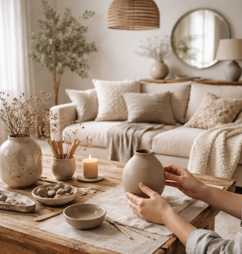 V realnih stanovanjih, kjer se dekoracija nabira skozi leta, serija pomaga tudi pri pomiritvi vizualnega šuma. Namesto da bi se dodajalo še en predmet, se tri obstoječe elemente poveže v skupino in postavi na pladenj ali v jasno omejeno območje. Doma izdelan pladenj iz lesa ali oblečen v tekstil je preprost projekt, vendar deluje kot okvir za vse, kar je na njem. Na ta način se dekoracija ne razlije po prostoru, temveč ga strukturira.