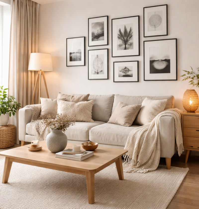Prvi korak je vizualno čiščenje. To ne pomeni sterilnosti, temveč ureditev. Ko se odstranijo podvojeni predmeti, embalaže, premajhne preproge in naključni okraski, se pojavita prostor in svetloba. Šele takrat postane jasno, kaj manjka. Pogosto manjka le ena večja poteza, na primer tekstil na oknu, slika primerne dimenzije ali en sam kos, ki določi barvni ton.